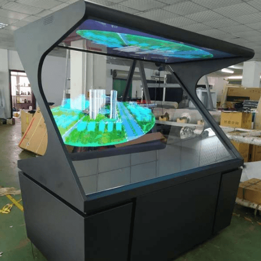 柜体时尚美观,有科技感;顶部四面透明,真正的空间成像;色彩鲜艳,对比度,清晰度高;有空间感,感,形成空中幻象;中间可结合实物,实现影像与实物的结合;也可配加触摸屏实现与观众的互动;