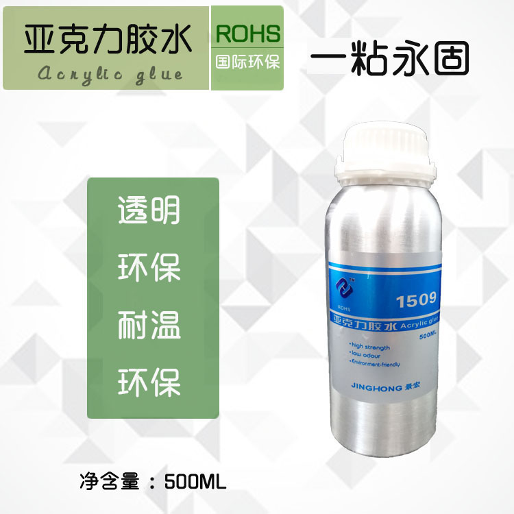 JINGHONG景宏 acrylicH-1509亚克力专用胶水是溶剂型亚克力胶水胶粘剂,分别使用于PS/PMMA/ABS/PC/PVC等材料、主要应用于塑胶玩具,塑胶工艺制品等之间粘接,具有优异之接著性;初步粘接快速,用途广泛。具有 具有可室温固化、操作方便、粘接强度高、快速定位、无痕等众多优点; 单组份、具有优异的耐水、耐热、耐寒、耐老化、耐酸碱、耐腐蚀性、耐油和无白化等优良特性;通过欧盟ROHS标准和SGS检测。